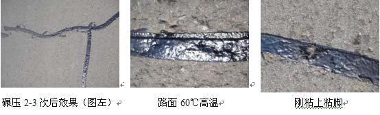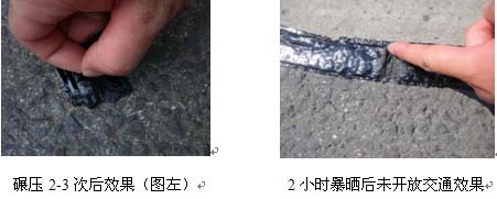3)在路面温度50℃左右时,能实现自动与路面的融合,但在路面温度达到60℃左右时,贴缝带较软且上层膜不易揭开,压实粘脚。