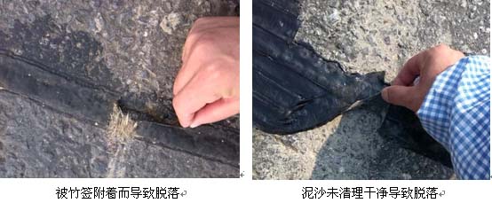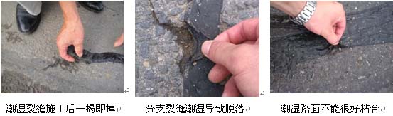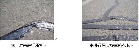 裂缝在潮湿状态下施工,导致贴缝带不能很好与路面粘合。