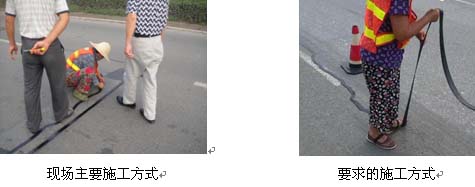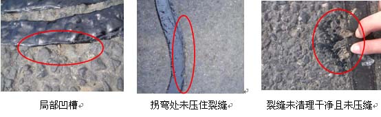在裂缝拐弯处由于追求效率未很好的密封裂缝,有些裂缝局部有较浅的凹槽较宽(而且部分凹槽有泥土,贴缝带短时间不能与路面很好融合),导致单条贴缝带不能封闭,导致也未进行多条压缝密封处理。虽纠正后大为改观,但仍有部分裂缝未很好密封,需要专门人员检查后修补。这种裂缝进水后,很容易导致贴缝带的脱落。