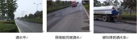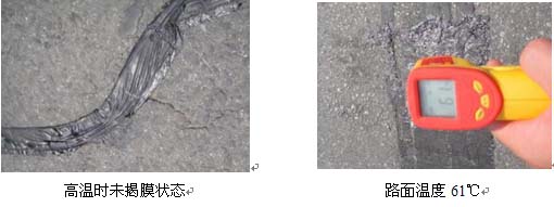 1) 在路面温度较高时(超过60℃),由于在粘贴时用脚压实粘脚,不能很好压实,揭掉膜后粘胎,导致脱落,这时不能揭膜,或者揭膜后洒上石灰粉或粒径小于1mm的金刚砂,防止车轮碾压脱落。