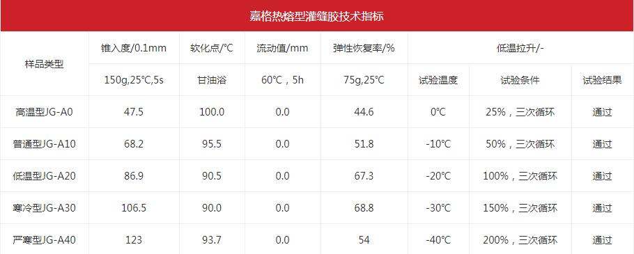 嘉格公司作为2015年的灌缝胶行标起草单位,每种路面灌缝胶的软化点均≥90℃。嘉格道路灌缝胶的流动值均为0mm,因此能保证材料夏季时不会出现因高温造成的发软、流淌等不良现象。