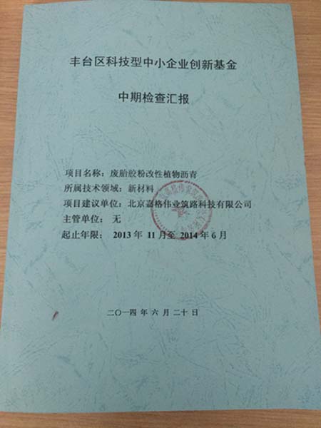 嘉格伟业,其科研项目【废胎胶粉改性植物沥青】2013年末获得了北京市丰台区科技型中小企业创新基金支持项目,并获得资金支持350000元,专项用于废胎胶粉改性植物沥青研究。至今项目研发过半,年中成果汇报工作正在有条不紊的进行中。技术部专门召开了专门会议,部署了中期总结汇报工作人员分工及时间要求。
