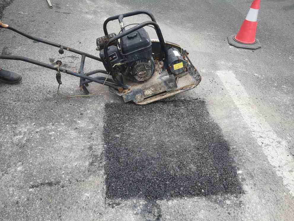 摊铺完成后,需要用压路机或平板震动夯对沥青冷补料进行压实。在压实的过程中,需要视情况选择用机械压实或者人工压实。深度超过5cm的坑槽,一定要进行分层压实(一般每5cm压实后再进行下一层)。最终压实后的坑槽部分,应比原有路面高出0.5-1cm左右。