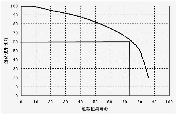 根据美国对不同等级道路进行的跟踪调查总结,在道路的使用性能和寿命方面有一个共同的特征,就是一条质量合格的道路使用寿命在四分之三的时间内,性能会下降百分之四十(把这个阶段称为预防性养护阶段),如不能及时进行养护,在随后的使用寿命时间内,性能会急剧下降,这样会造成养护成本大幅度的增加。如图所示